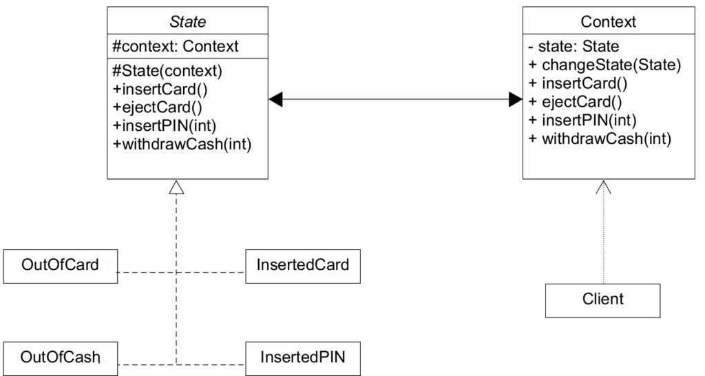 UML diagram above shows base abstract class with four methods, with four classes which are representing ATM’s state. Every state is containing a reference to Context – an object which will be some sort of ATM’s state medium, which is gonna manage them -> for example, if we have an ATM without card, and user inserts the card, we have to pass from OutOfCard state, to InsertedCard state. To integrate them we have context, which is gonna hold current ATM’s state, and change it basing on taken actions. What is worth saying is fact, that the reference between State and Context is mutual to induce state change if necessary.