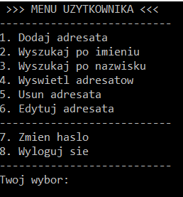 Adress Book – console application written in C++/OOP aswell. Main goal was to practice OOP on adress book created earlier by procedural programming. Features are very similar to Budget App. Firstly user is registered, so there is a possibility to log into program. Then user can freely create a recipient with features like – name, surname, e-mail, phone number, home adress.